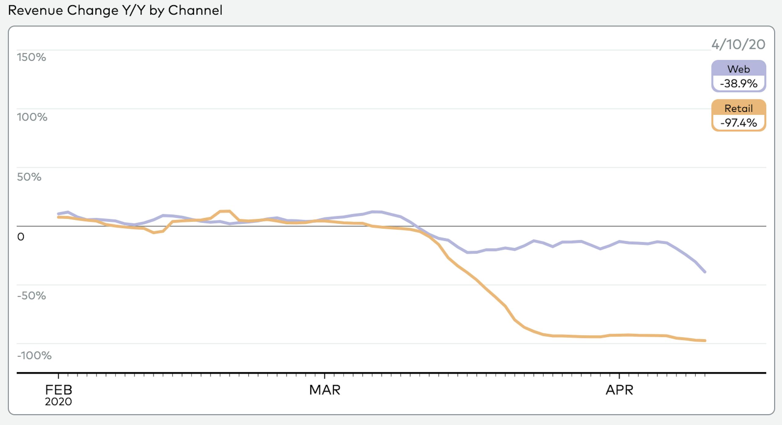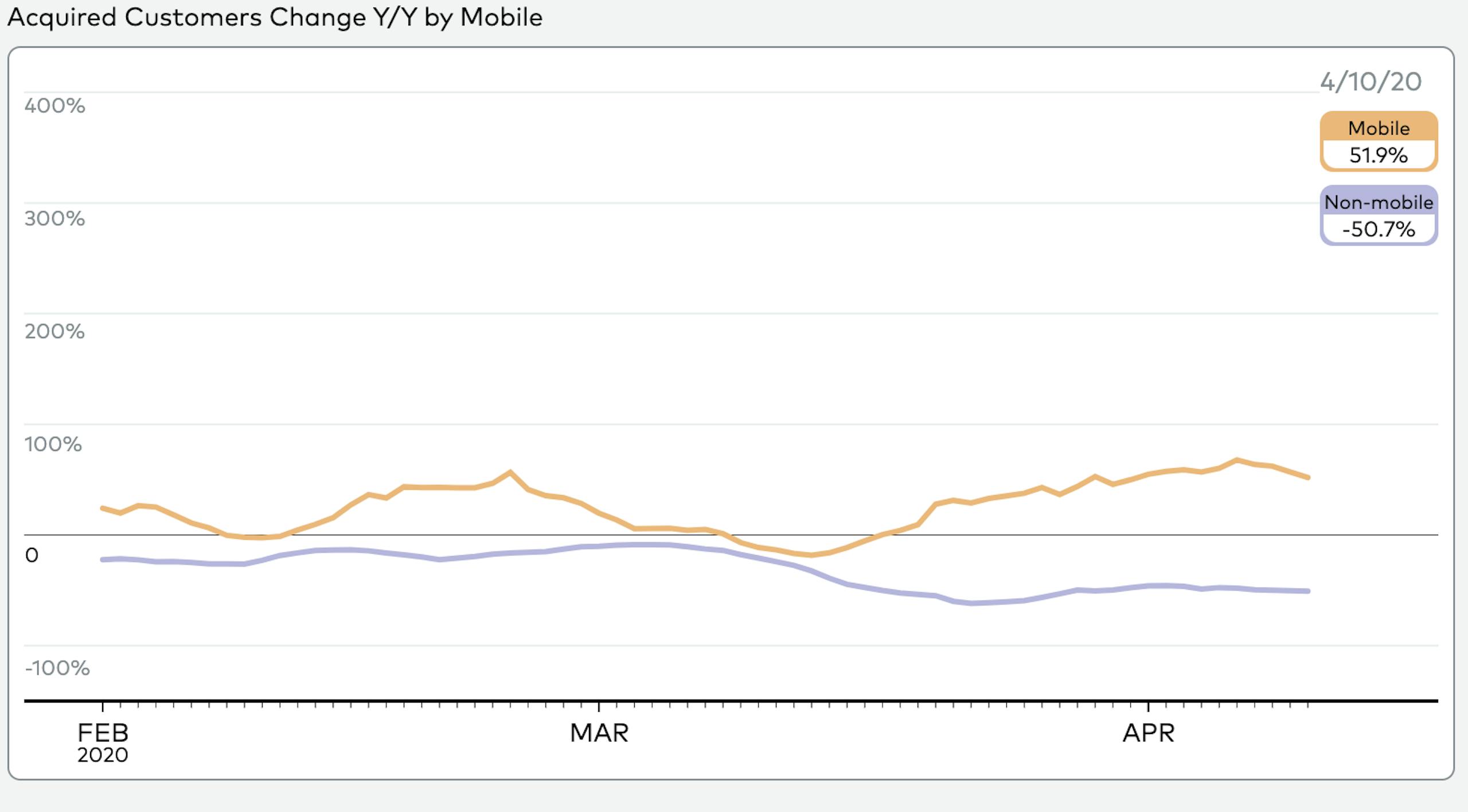 Overall retail demand has fallen 69% Y/Y, but online purchasing was only down ~38% at the end of the week. This is mainly the result of strong mobile performance — as customers spend more time on their phones, mobile was actually trending up Y/Y. Mobile has been particularly successful in driving new customers to purchase — the channel has consistently outperformed non-mobile by ~60% over the past several weeks.